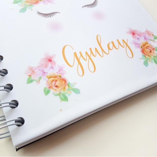 Una práctica y bonita agenda personalizada con anillas, con todo lo que necesitas para tu organización diaria, semanal y anual. Tiene un diseño de unicornio en tonos blancos, naranjas y rosas.